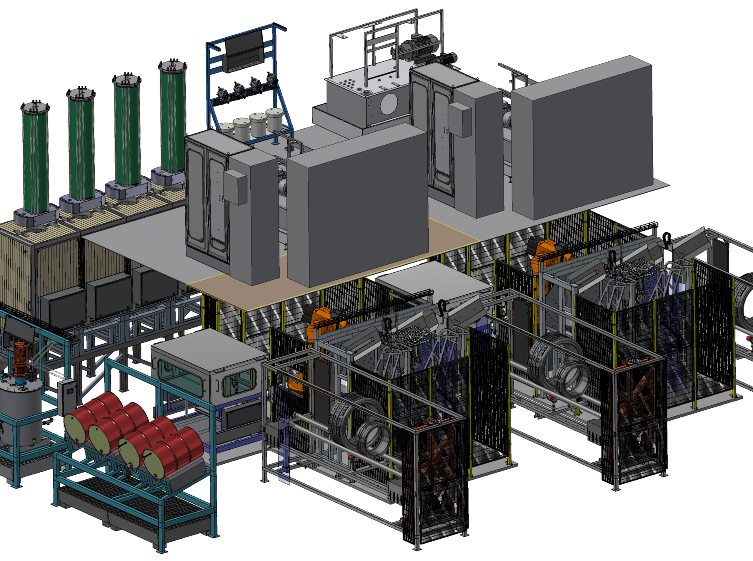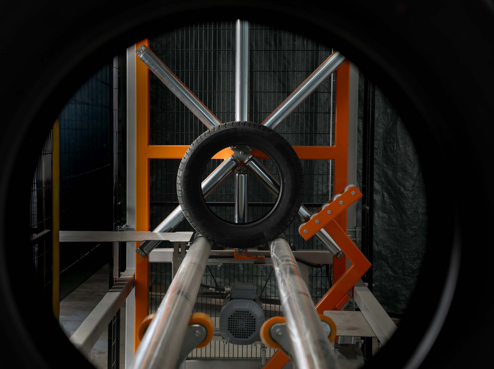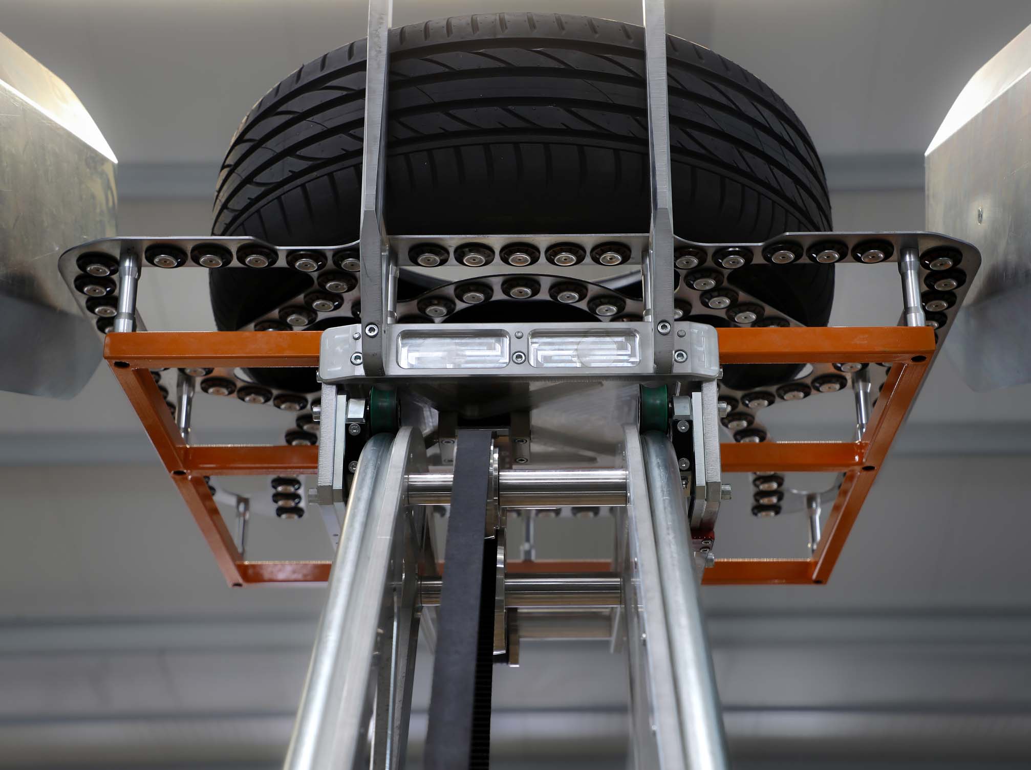 Die Sondermaschine RDV-2 sorgt für den reibungslosen Durchlauf der Reifen innerhalb der Anlage. Sie ist ausgestattet mit 2 Stationen zur optimalen Ausnutzung der Dosieranlage und des Roboters.