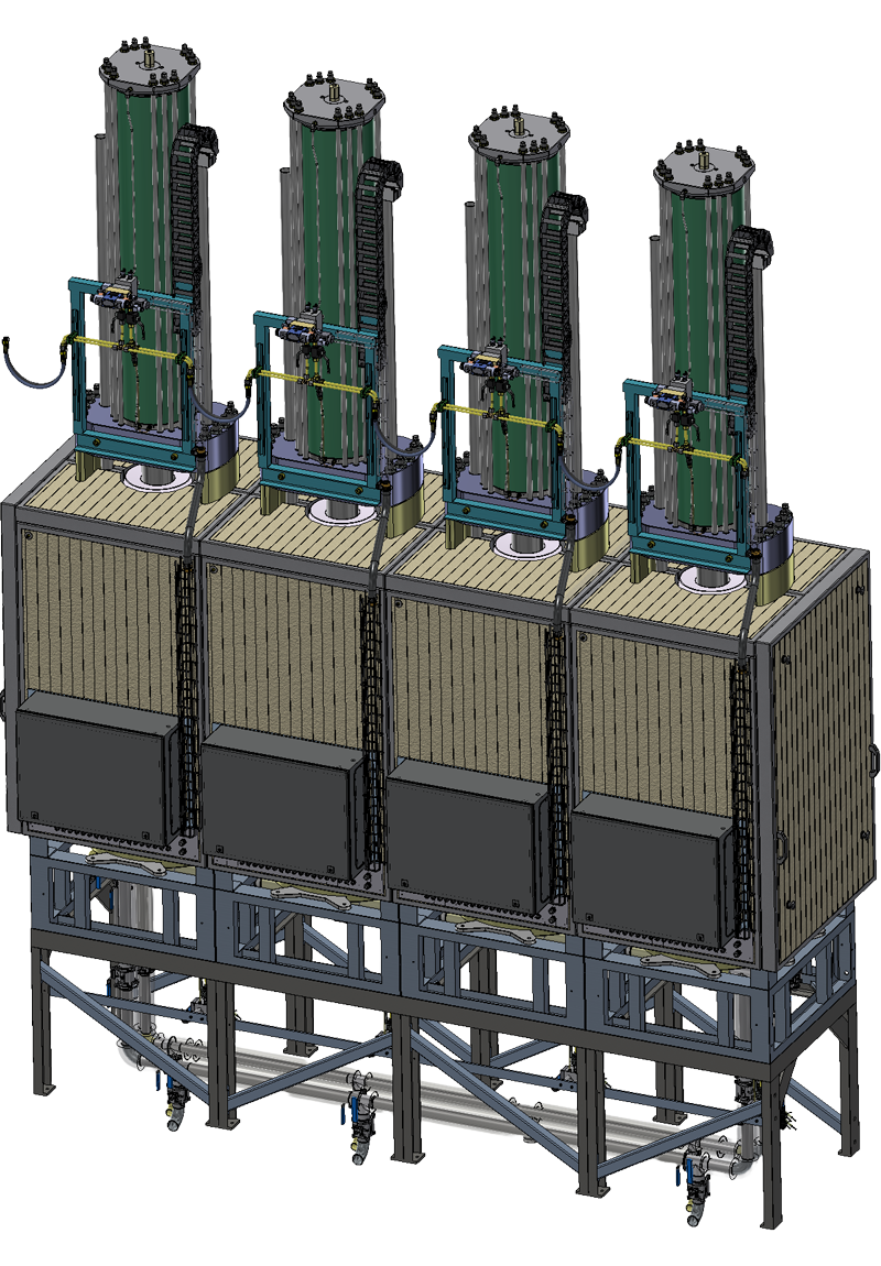 DAS SYSTEM IST ALS 2-KOMPONENTEN-HOCHDRUCK-MEBRAN-DOSIER-ANLAGE MIT 4 ACHSPAAREN (3 FÜR DIE A- UND 1 FÜR DIE B-KOMPONENTE) UND EINER GEMEINSAMEN ZENTRALHYDRAULIK AUSGEFÜHRT: