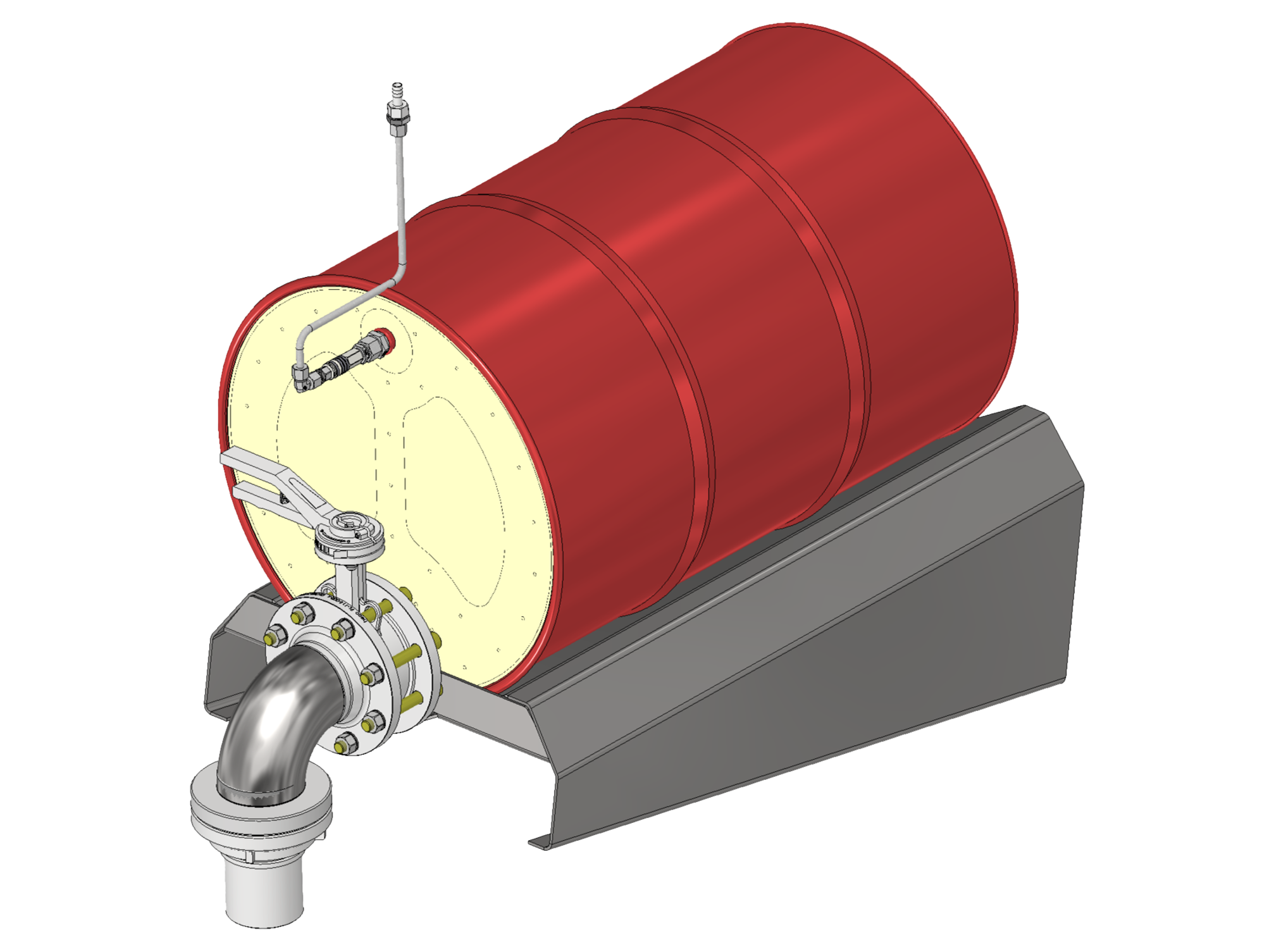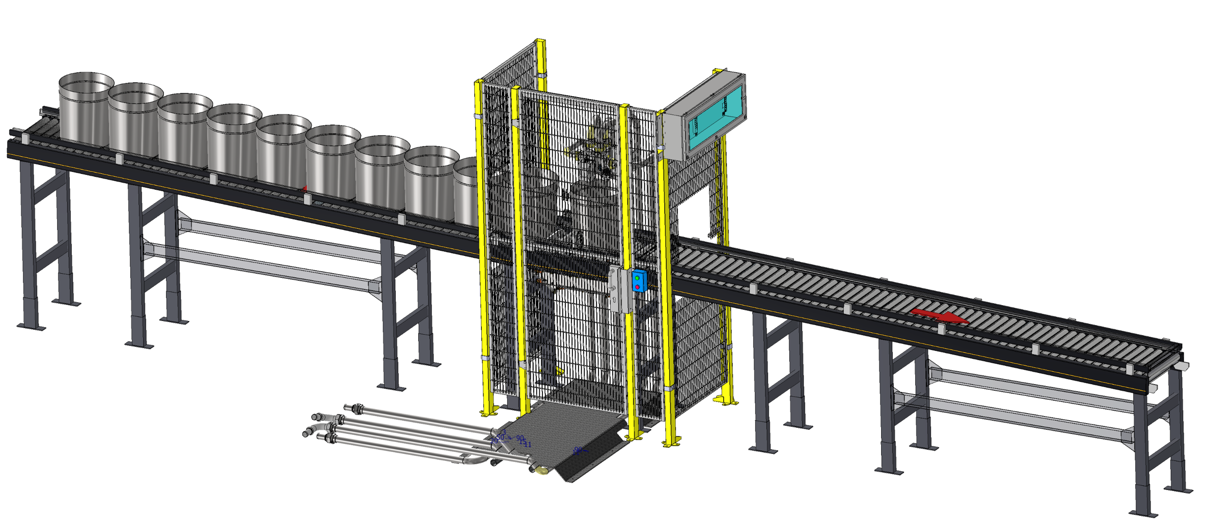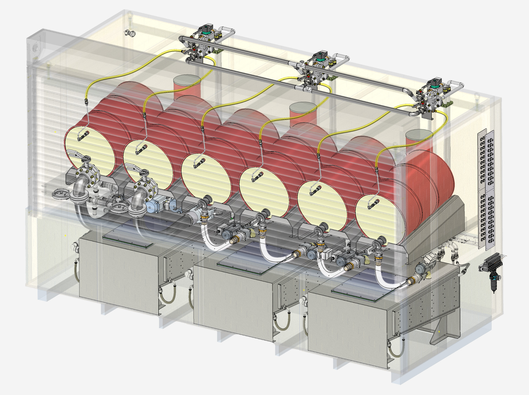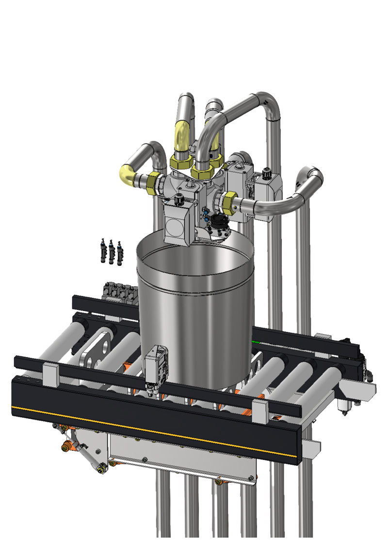 Industrielle Material-Station zur Handhabung von 3 Flüssigkeiten, geliefert in 220-Liter-Fässern.